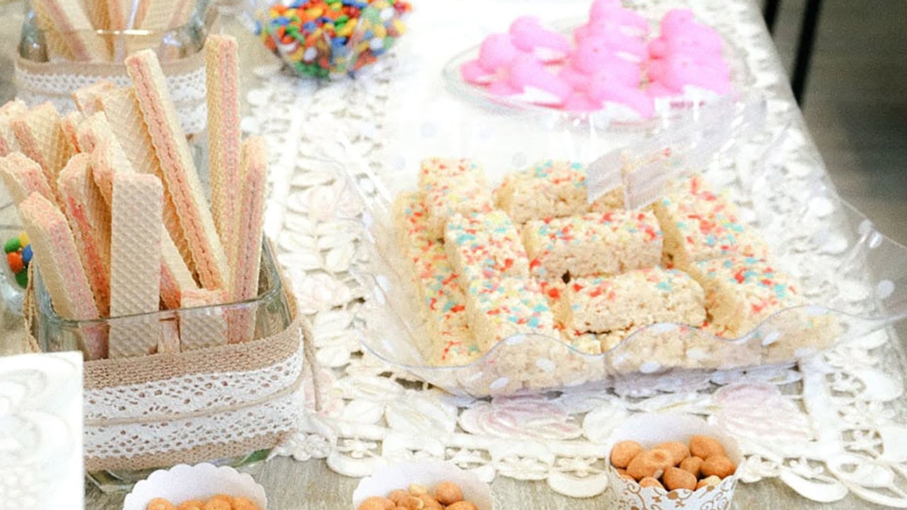 One bag of marshmallows and a box of crispy rice cereal will get you a whole tray of these for under $5. Melt the butter and marshmallows together, stir in the cereal, and press into a pan.