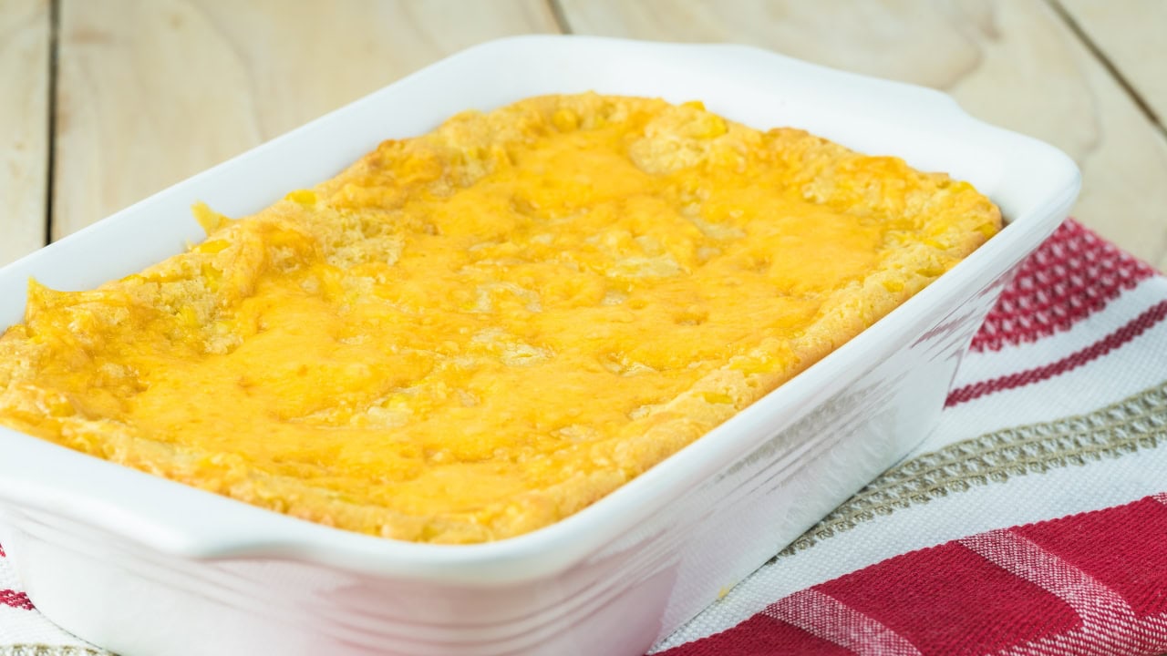 This one is basically a hug in a dish and uses pantry ingredients. Stir together 1 box Jiffy corn muffin mix, 1 can whole kernel corn (drained), 1 can cream-style corn, 1 stick melted butter, 1 cup sour cream, and 1 beaten egg.
