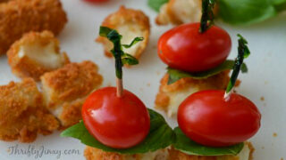 This easy-to-make appetizer uses frozen mozzarella sticks combined with cherry tomatoes and fresh basil. They take only a few minutes to put together, but look extra special.