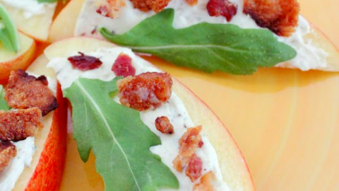 Apple slices are spread with seasoned cream cheese and then topped with arugula and bacon crumbles in this delicious and easy-to-make appetizer.