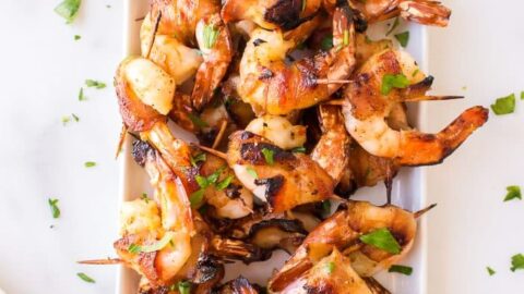 Juicy shrimp are wrapped in crispy bacon and brushed with a sweet and spicy honey Cajun glaze in this eleveated appetizer.