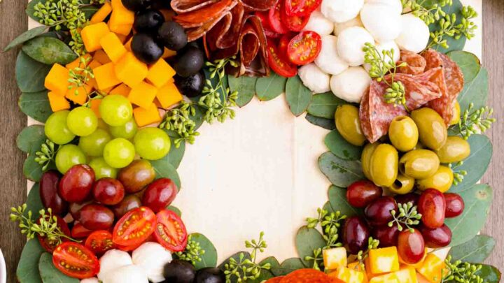 For a festive charcuterie board option, while it's designed to be a Christmas wreath, it looks great on a New Year's Eve table s well! It's packed with good things to eat. The salami rosette is my favorite!