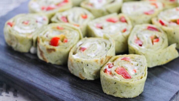 Starting with spinach tortilla wraps makes this appetizer perfect for a hand held nibble. The little pinwheels are filled with cream cheese, ranch seasoning and red bell pepper.