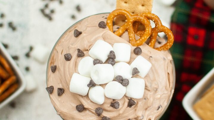 For a deliciously sweet winter season appetizer, try this Hot Cocoa Dip! It has all the flavors of a cup of hot chocolate blended up in a cool and creamy dip perfect for dipping graham crackers, pretzels, cookies and more.