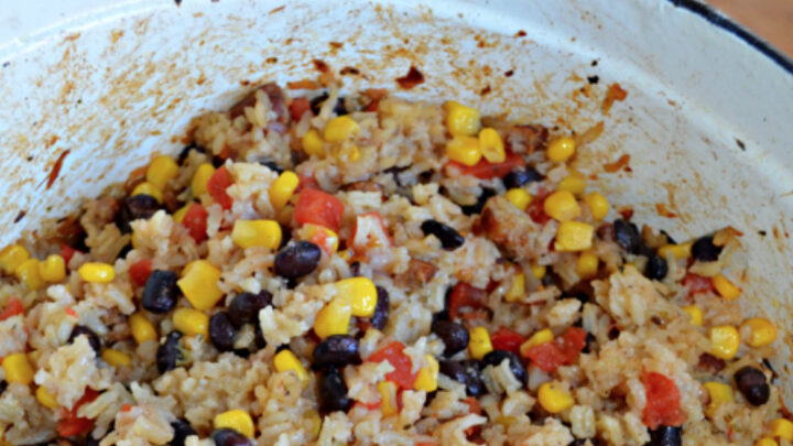 This easy Mexican Rice Casserole recipe with black beans, sausage and corn, is an easy-to-make one-dish meal that goes from stovetop to oven with very little work on your part. It is also a very thrifty recipe that is CHEAP to make!