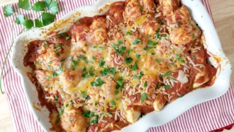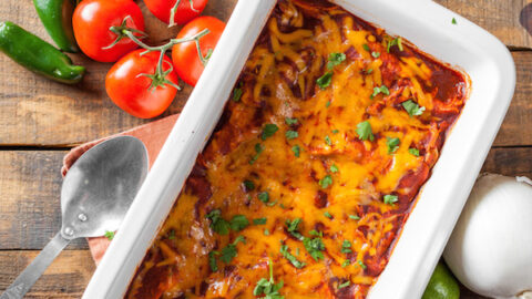 This easy enchilada casserole recipe ditches the tedious work of rolling up your enchiladas. Instead, you only have to add your ingredients in layers in a casserole dish and bake.