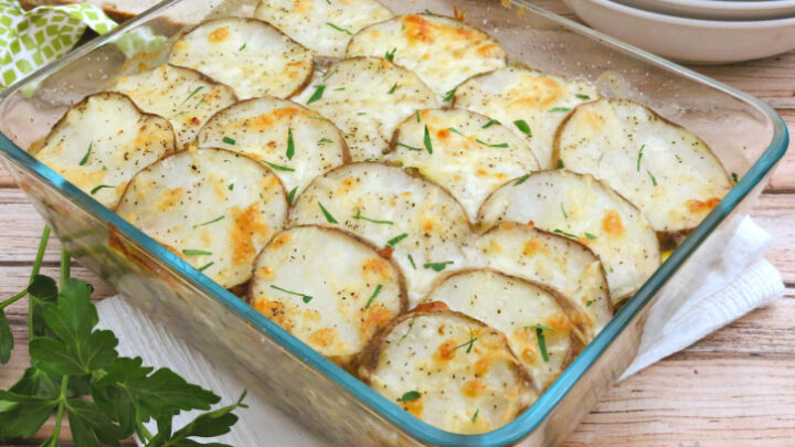 This Layered Shepherd's Pie casserole has all the flavors of the shepherd's pie we love but with a little twist. Instead of the classic mashed potato topping, we thinly slice potatoes and layer them with a savory beef filling and a little cheese. The top potato crust is crispy and delicious!