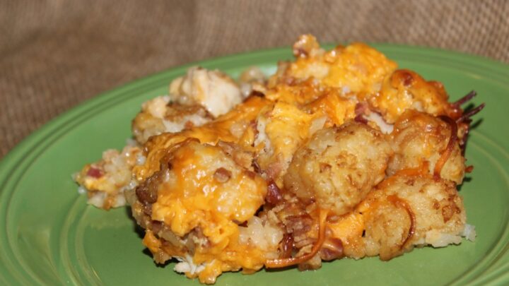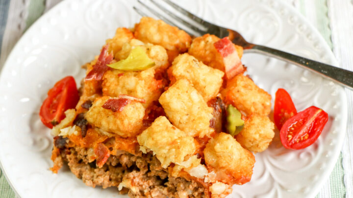 All the flavors of a yummy bacon cheeseburger combine to make this delicious Bacon Cheeseburger Tater Tot Casserole! It's super easy to make and features all the yumminess of bacon, burger, cheese, tomato and pickles – all topped with tater tots.