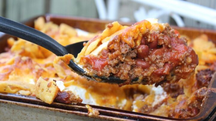 This yummy recipe is packed full of meat, beans, tomatoes, cheese, and more. Add in a layer of sour cream on top, as it adds a really nice flavor to the mix! Plus it has two layers of chips, and you can always add more chips for the crunch you desire.