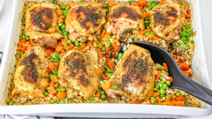 Tender, juicy, chicken thighs seasoned with a light blend of herbs are baked to perfection over brown rice in this chicken and brown rice casserole that’s easy to make, easier to clean up, and the perfect busy weeknight recipe!