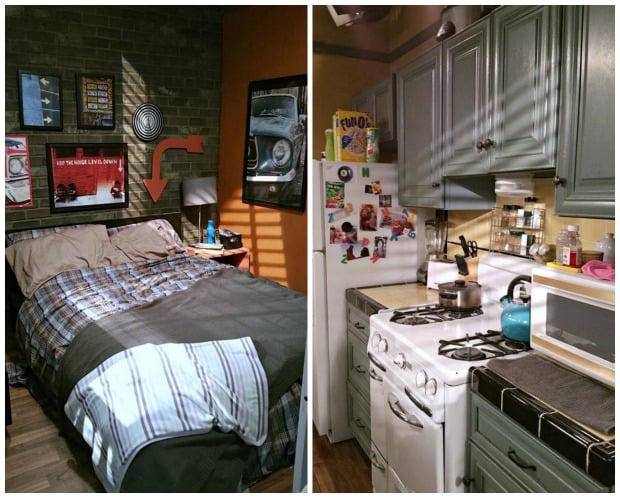 Since the show is primarily set in the guys’ bachelor pad, it was fun to see how the set designers took care to make sure it was really a GUY place – with a little baby thrown in of course! There were lots of cool little details like photos, ticket stubs on the fridge, and even “dirty” dishes in the sink.