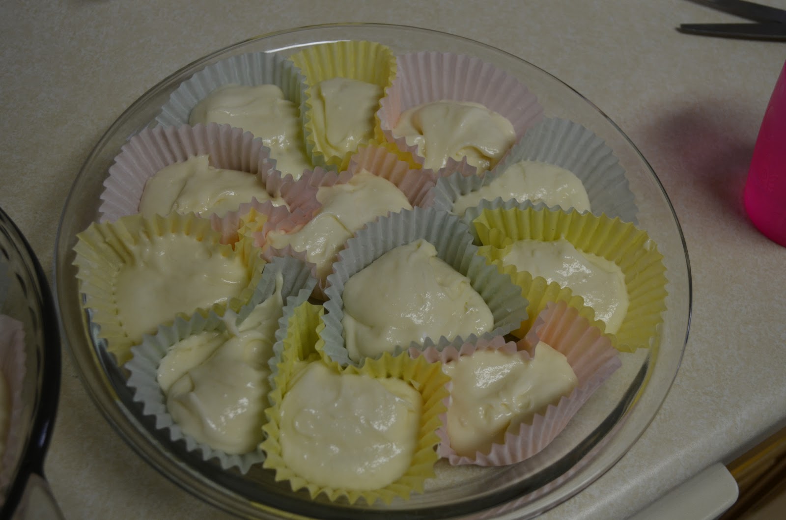 Using two 9″ round pie plates, nestle 12 cupcake papers into each.