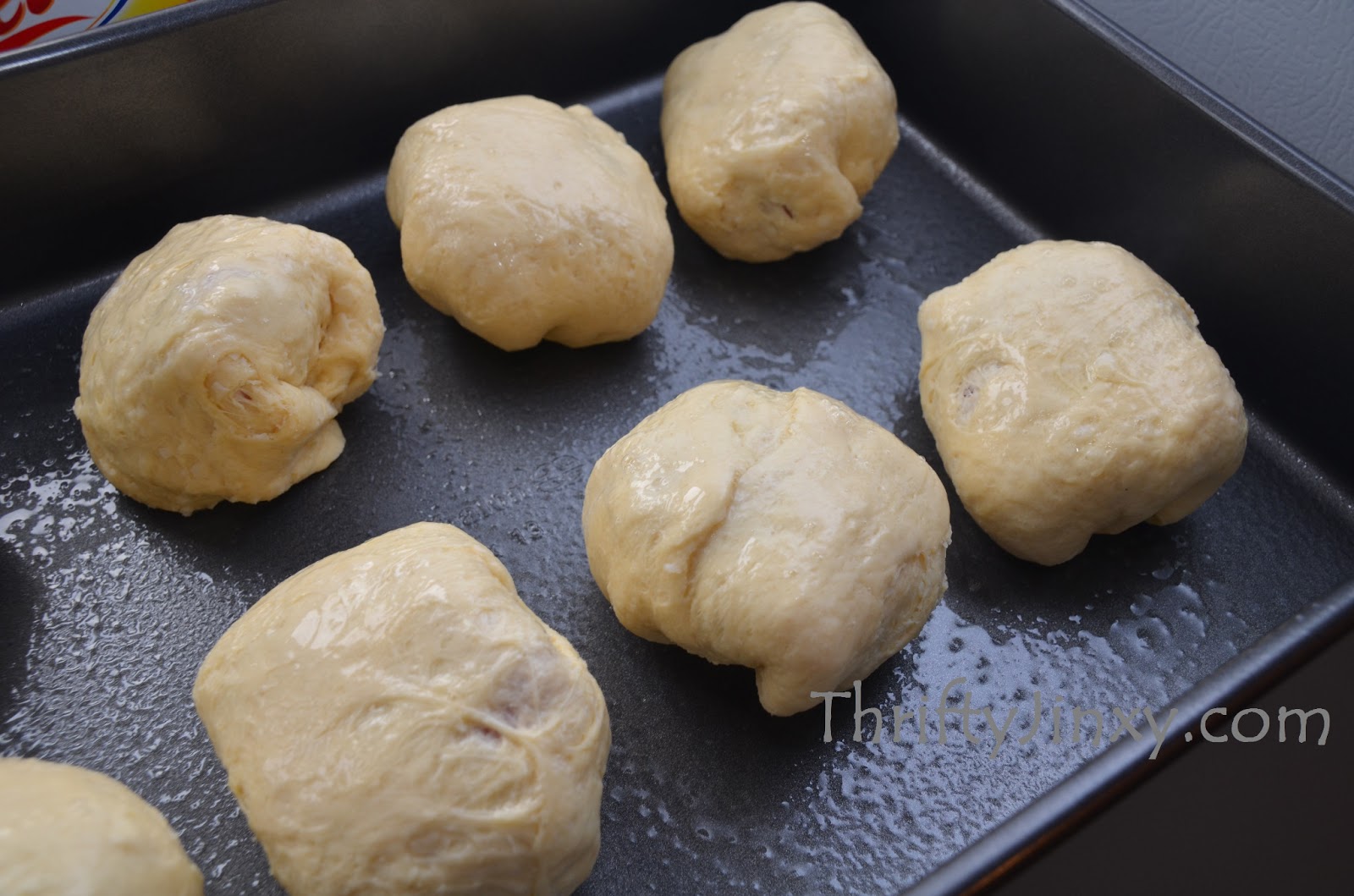 - Wrap up each biscuit with the filling inside and place (seam side down) in a greased 9x13 baking pan.