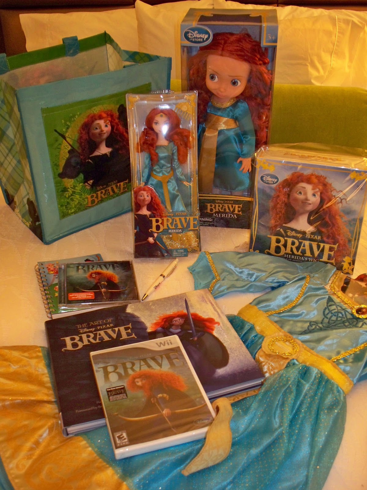 The Formal Merida Costume for girls is beautiful and there is even a Merida curly wig – you just gotta love that red hair! There are also Merida dolls including a fashion doll and a toddler doll. We got the BRAVE video game for Wii, but it’s also available for Xbox 360, PS3, Nintendo DS and PC. (NOTE: The deal I posted a last week to get a $20 credit and free ticket to BRAVE when you preorder the video game is still available, but I believe today 6/18 will be the last day.) There is also a beautiful “Art of Brave” book that I will be keeping for myself, along with a copy of the amazing film score by Patrick Doyle. Most of these items are already available through DisneyStore.com.